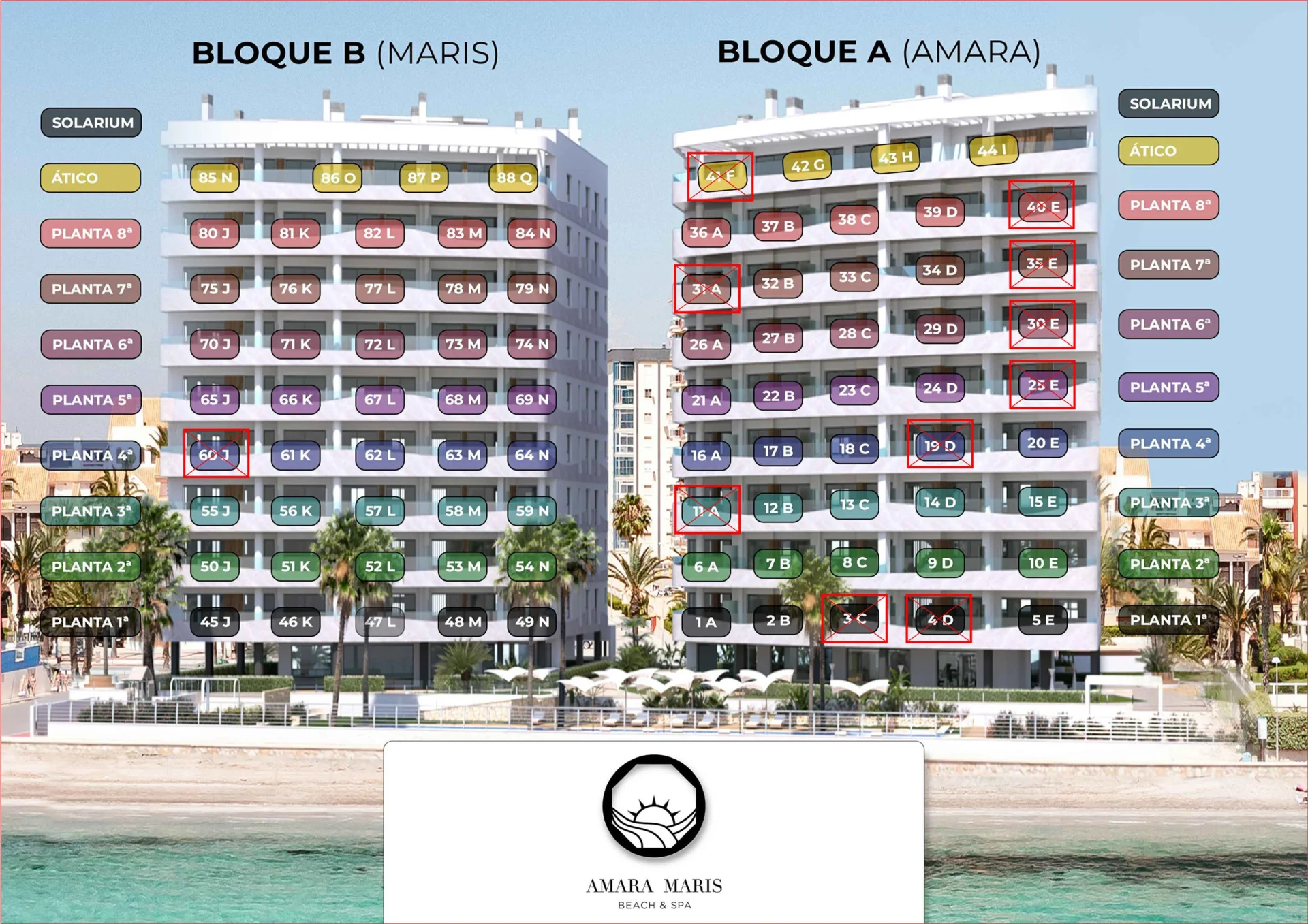 AMARA MARIS Beach & Spa to nowa, luksusowa inwestycja mieszkaniowa zlokalizowana nad brzegiem Morza Śródziemnego, w przepięknym kurorcie La Manga del Mar Menor, na wybrzeżu Costa Cálida. Inwestycja składa się z dwóch 9-piętrowych budynków z 1 do 3 sypialniami, apartamentów z tarasem z widokiem na morze we wszystkich nieruchomościach, zagospodarowanych części wspólnych, imponującego basenu, siłowni i sauny. Odkryj nasze nieruchomości w La Manga, oszałamiającym obszarze pomiędzy Morzem Śródziemnym a Mar Menor w Hiszpanii, raju dla osób poszukujących luksusu życia w malowniczym otoczeniu.